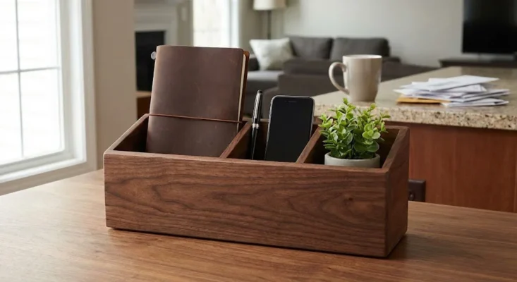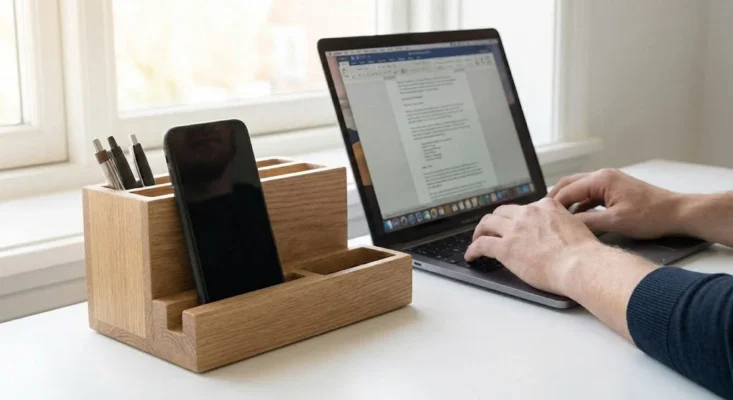 The Morning Commute (at home): The act of placing your smartphone into its dedicated slot in your wood organizer is your “new commute.” It signals the start of Deep Work.