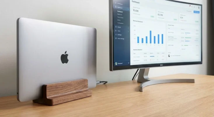 The Vertical Docking Station: By using a vertical wood stand for your laptop, you reclaim nearly 40% of your desk’s surface area. This allows your laptop to function as a hidden engine while you work on a larger, high-resolution monitor.